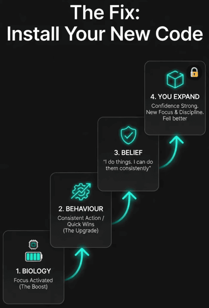 Nervous system stuck in survival mode. Biology → Behaviour → Belief → Shame → Repeat.